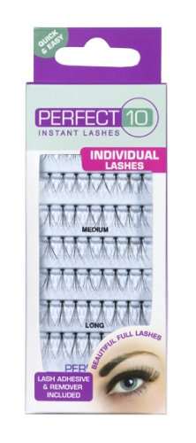 Perfect 10 Instant Individual Lashes. Lash adhesive and remover included; Simple to use; Safe and hygenic; Short, Medium and Long Length . Perfect 10 Individual semi permanent lashes in three different lengths that last up to 4 weeks. Short for inner lashes, medium for centre and long for outer lashes. Read instructions enclosed in full before use. Contains 16 x Short, 24 x Medium, 16 x Long length lashes; 1ml Individual lash adhesive; 2ml Individual Lash Remover; Instruction Leaflet